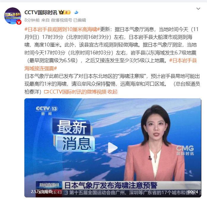 日本气象厅此前已发布了对日本东北地区的“海啸注意报”,预计岩手县局地可能出现最高约1米的海啸,请沿岸民众保持警惕,远离海岸和河口区域。 (总台报道员 柏春洋)