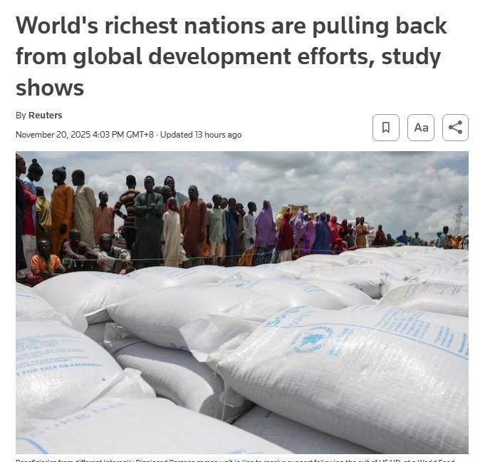 r路透社11月20日刊发的报道指出,全球最富裕的国家,包括美国和日本,正在逐步缩减对全球发展领域的援助投入。“全球发展承诺指数”显示,多国持续削减在全球卫生、气候变化和移民等关键领域的资金支持。这一趋势的背后,主要源于发达国家政策的转变,例如美国政府大幅削减对外援助,直接导致美国在全球发展援助中的排名下滑。